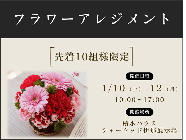 1/10(土)~12(月)積水ハウスシャーウッド伊那展示場にて、フラワーアレンジメント体験を開催いたします。