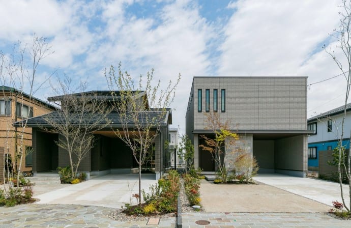 深い軒下と南側建物の外壁に包まれるタイル床のテラスは居心地の良い休日家族のいどころになりそうです。