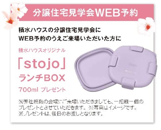 見学会開催中、WEB予約の上ご来場いただいたお客様に、積水ハウスオリジナル「stojo」ランチBOX(700ml)プレゼント!