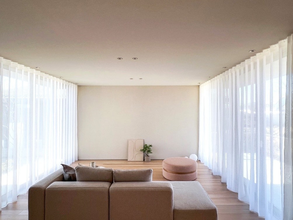 ・床や壁、天井、家具までも淡いグレーと温かみのあるベージュのグラデーションで仕上げた穏やかな空間です。