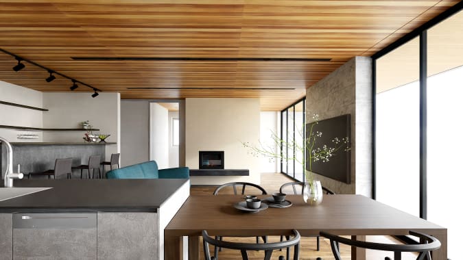 ・開放感あふれる大きな開口部と木質の美しさが印象的なリビング