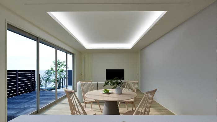 今回案内させて頂く現場は、折り上げ天井と大開口サッシが作り出す大空間が魅力の住まいです。