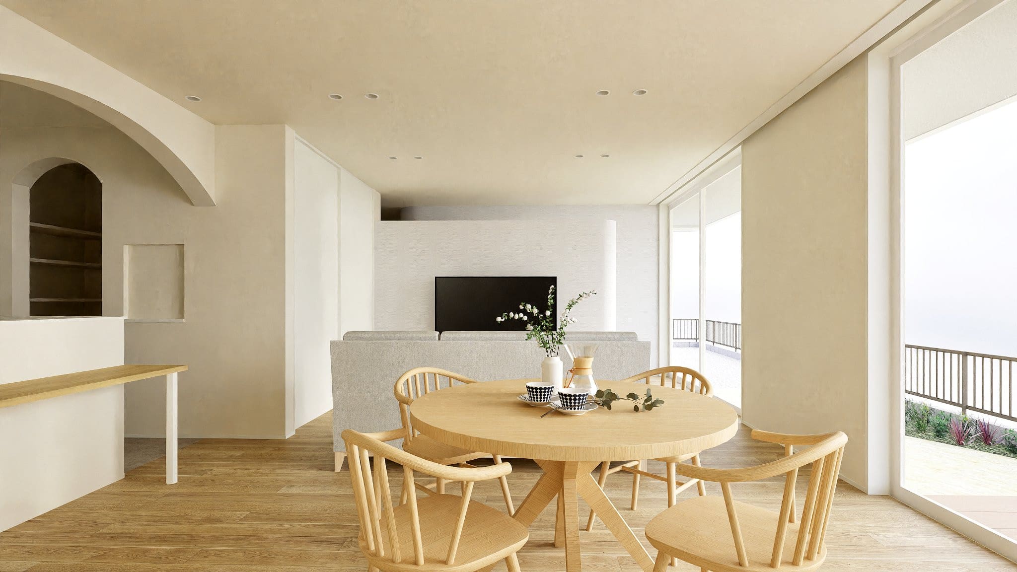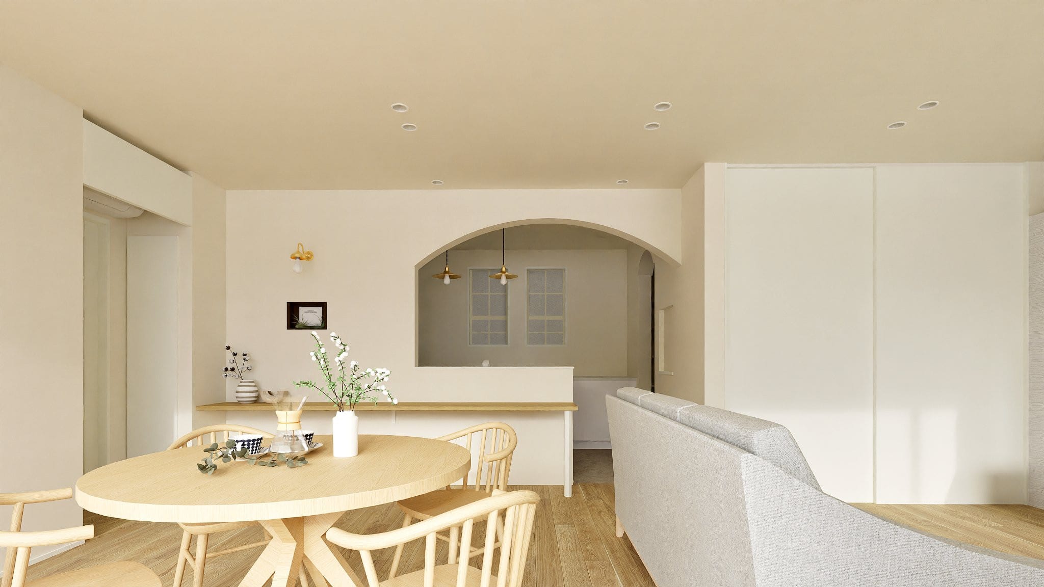 塗り壁とアーチ垂れ壁がつくる、プロバンスの風を感じるやさしい空間。