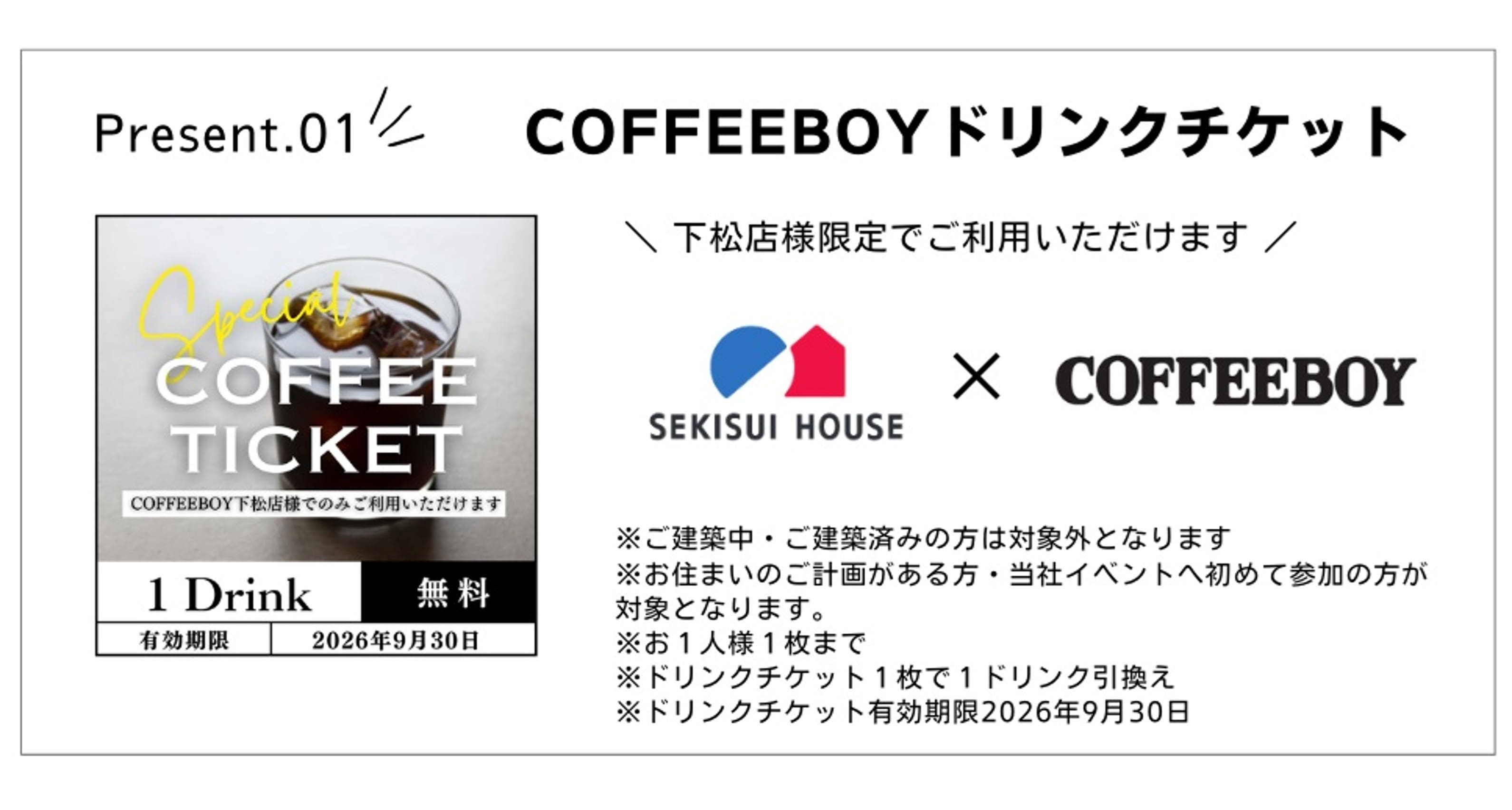 ご予約の上ご来場いただいた方にはCOFFEEBOY下松店様でご利用いただけるドリンクチケットをプレゼント♪