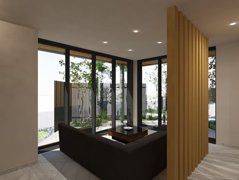 坪庭をゆっくり眺められる居場所としました。住戸内部は、広々としたリビングルームとし、入居者がゆっくりと過ごせる空間となっております。