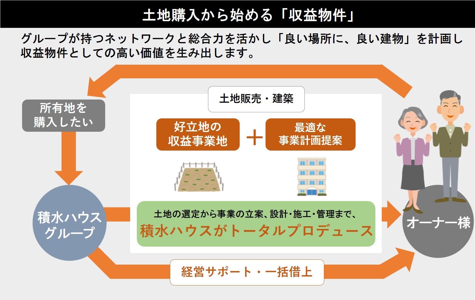 積水ハウスグループが持つネットワークと総合力を活かし、「良い場所に、良い建物」を計画し、収益物件としての高い価値を生み出します。
