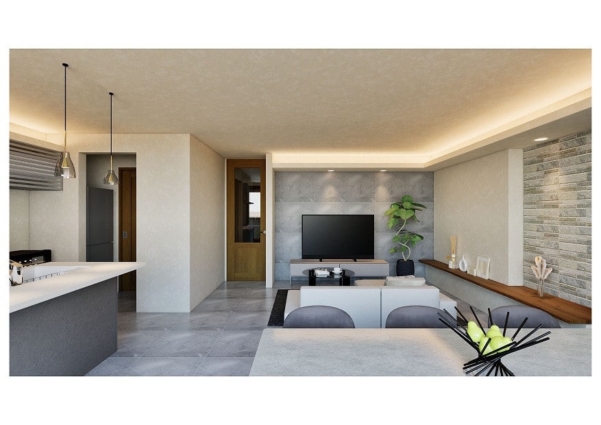 ■磨きタイルの床×天然木のカウンターを取り入れた内装計画