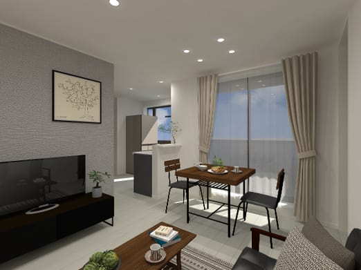 ベースの床カラーは、チェスナットホワイト色を提案する事で、明るさを感じる空間として、アクセントとしてグレーの壁紙を貼りモダンでスタイリッシュな居室としています。(パースは実際の図面をもとに描きおこしたもので実際のものと違う場合がございます。)