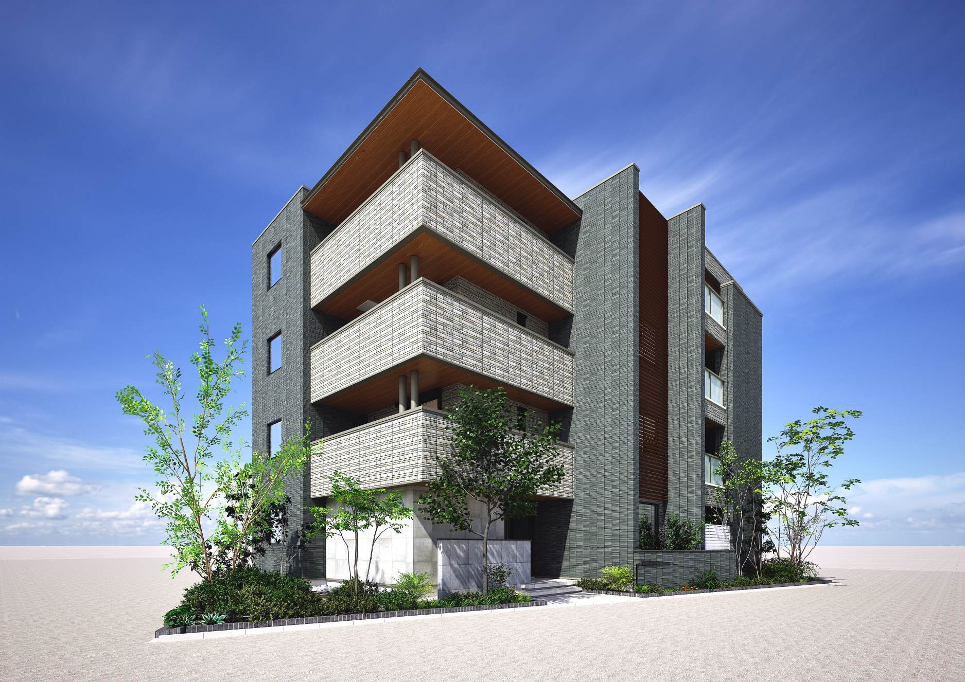 反対側の角面にはハイウォールを立ち上げ、街のランドマークとなる4層の外観を実現しました。