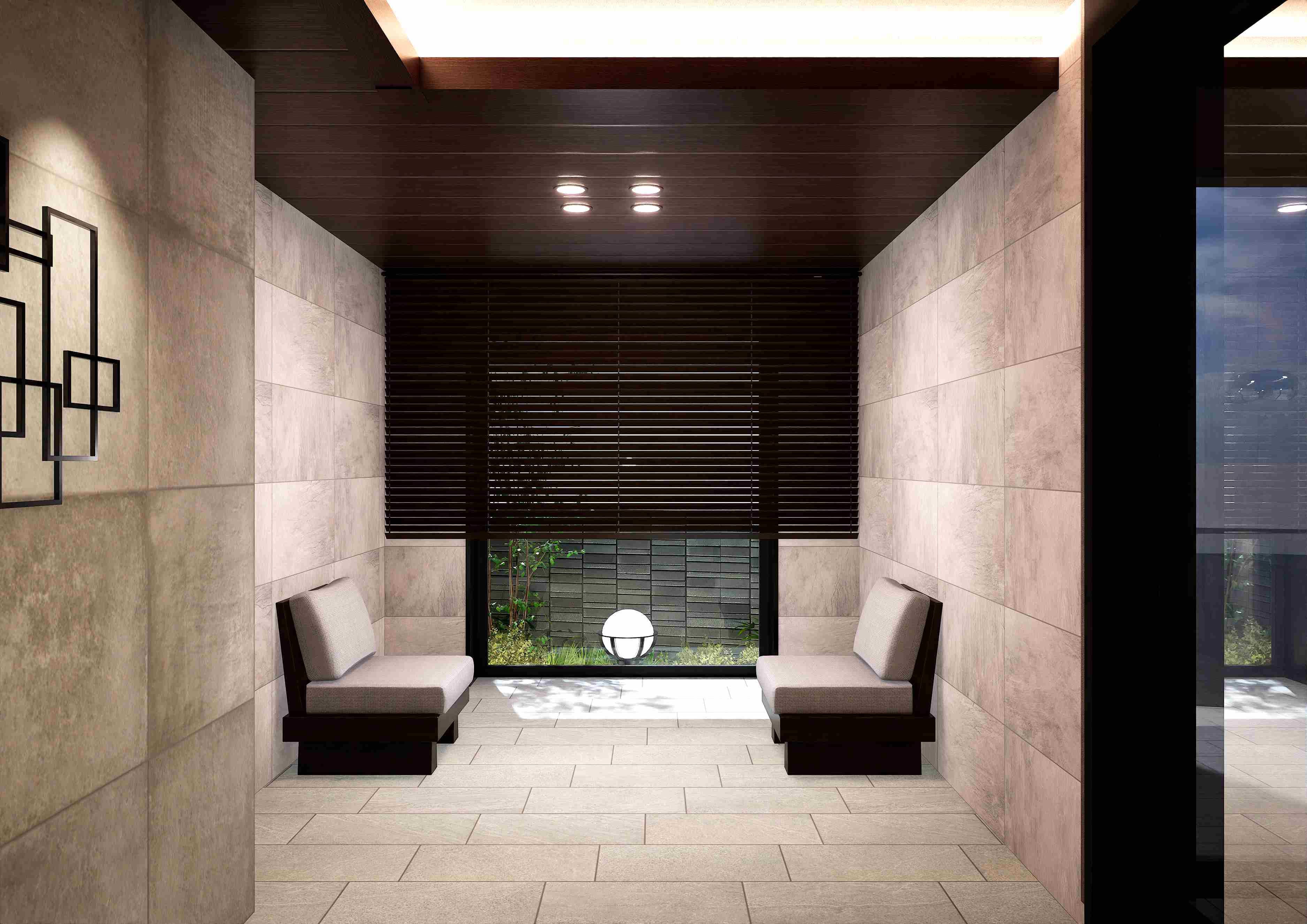 共用部には、コンパクトながら上質なラウンジをご提案。さらに、エントランス付近には植栽の中を通り抜ける小径(こみち)を計画し、お子様が日常で緑に触れられる、遊び心あるアプローチに仕上げています。