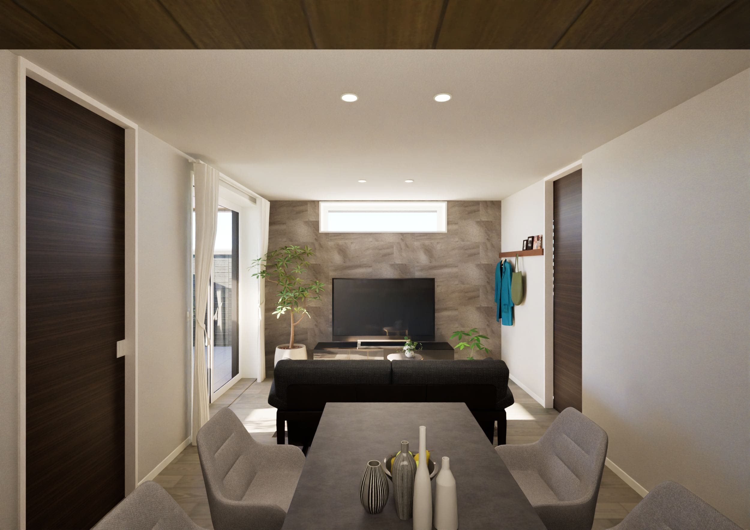暮らしを満たすゆとりあるリビング。リビングとつながるバルコニーには水栓を設け、ハイウォールで守られた中でお子様が安心して水遊びできるように配慮しています。