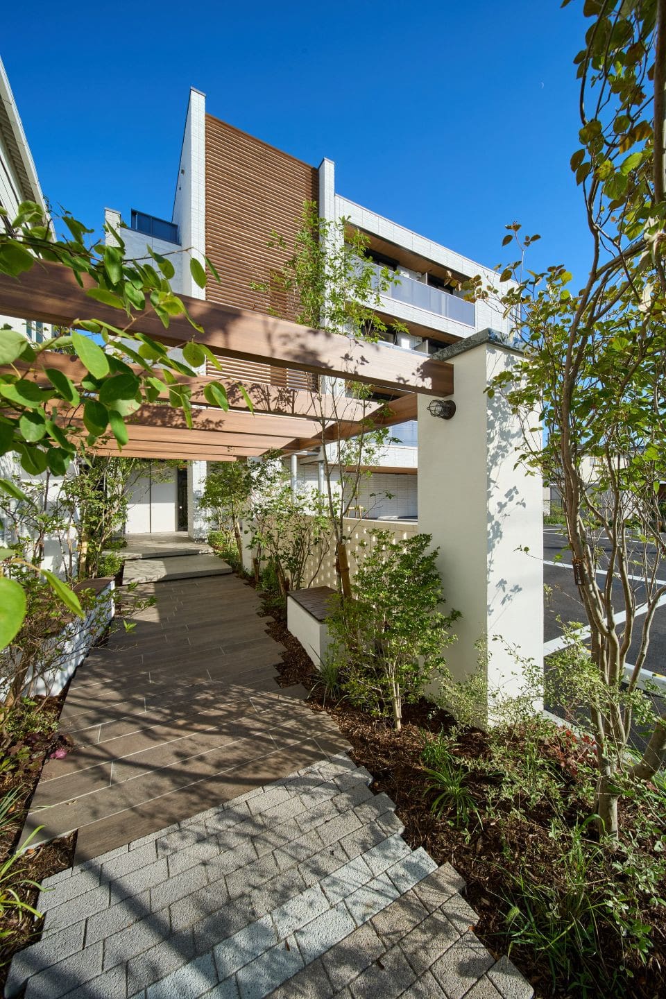 街並みに調和する外観デザインと安全性に配慮し道路から奥行きを持たせたアプローチには、海から里山へと続く物語を床素材と植栽で表現。
