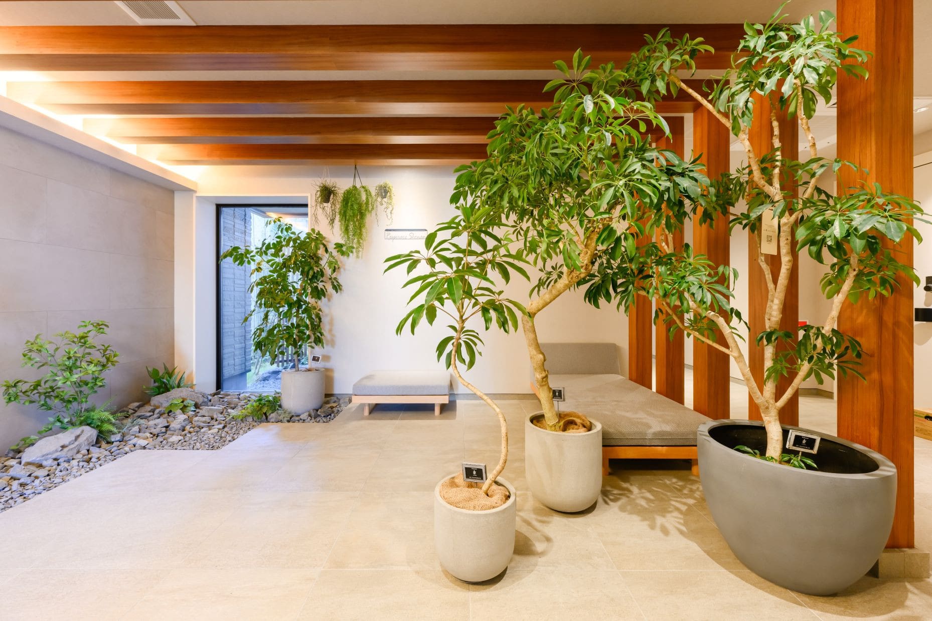 パーゴラと同色のあらわし梁、柱をつくり心安らぐ緑陰空間を創出。