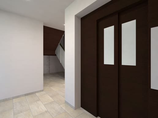 階段下の天井面、EV扉は茶系の落ち着いた色で統一して壁面は一部にタイルを採用して空間にアクセントを。
