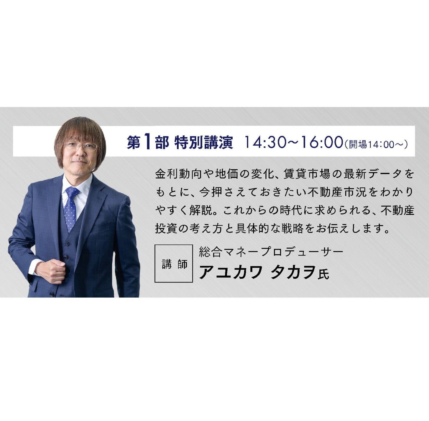「不動産はエンターテイメントだ!」をモットーに『人生自由化計画』を提唱。現在は総合マネープロデューサーとして、人生における「マネーリテラシー」の重要性をメディア、YouTube「アユカワTV」、著作、セミナーなどで伝えている。年間のセミナー数は300本を超える。
