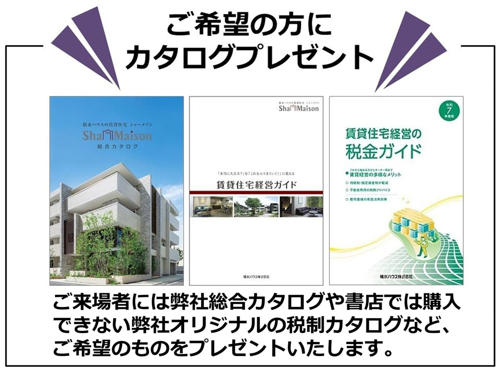 賃貸住宅経営の基礎知識や、相続税・贈与税の仕組みなど、土地活用をお考えの方に役立つカタログを無料で差し上げます。