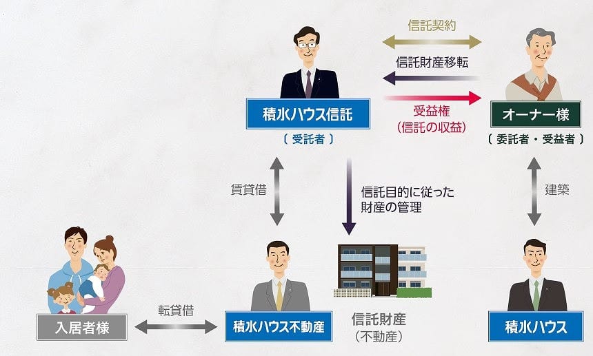 土地を信託し、積水ハウス信託が受託者として管理・運営を行うことで、オーナー様はご自身の手を煩わせることなく、安定した賃貸収益と将来のスムーズな承継をご検討いただけます。