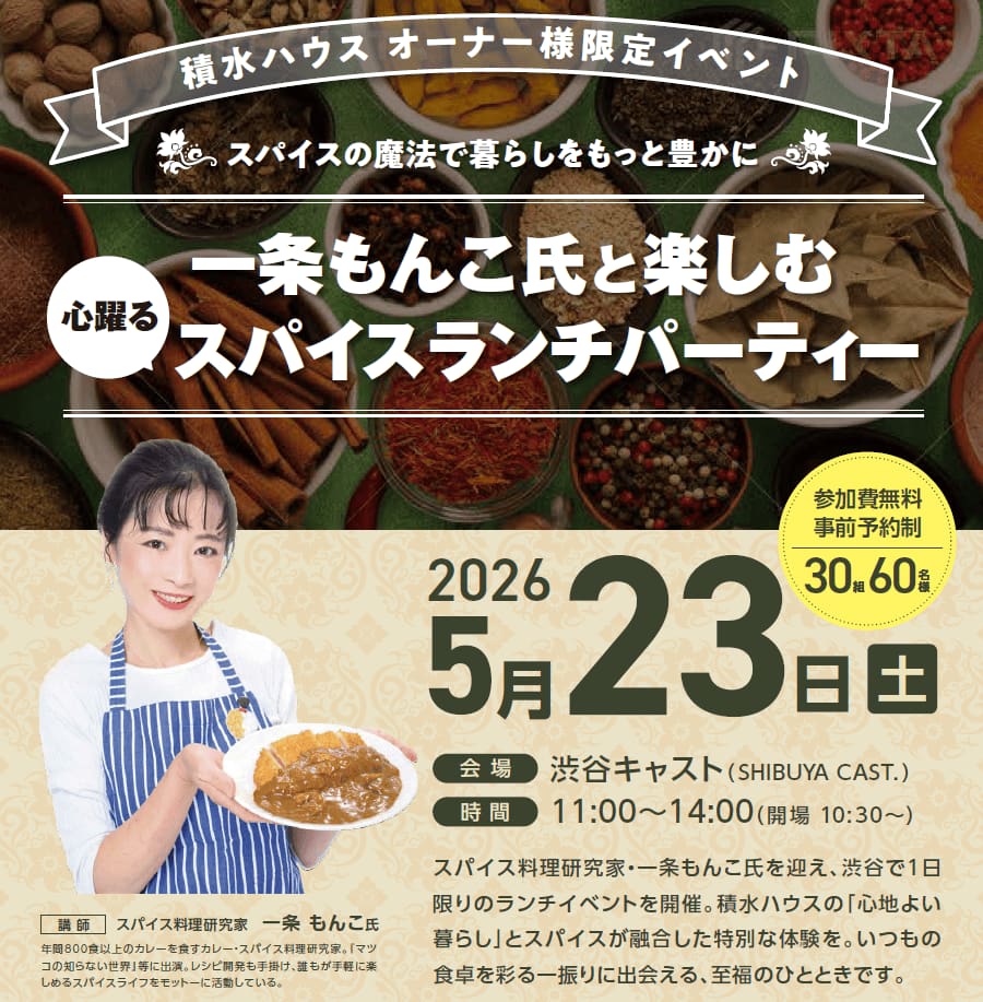 スパイス料理研究家・一条もんこ氏を迎え、渋谷で1日限りのランチイベントを開催。積水ハウスの「心地よい暮らし」とスパイスが融合した特別な体験を。いつもの食卓を彩る一振りに出会える、至福のひとときです。