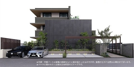 重厚感と落ち着きを感じさせるファサードはどの角度から見ても洗練された雰囲気をまとい、賃貸住宅でありながら邸宅のような存在感を放ちます。「月と侘び寂び」をコンセプトにした共用部にはオリジナルのアイアンアートや照明が施され、訪れた瞬間からここでの上質な暮らしへの期待を高めます。さらに、ビルトインガレージを備えた住戸は、愛車を守るだけでなく、雨の日も快適な動線を確保し、機能美と優雅さを兼ね備えた空間を実現しています。