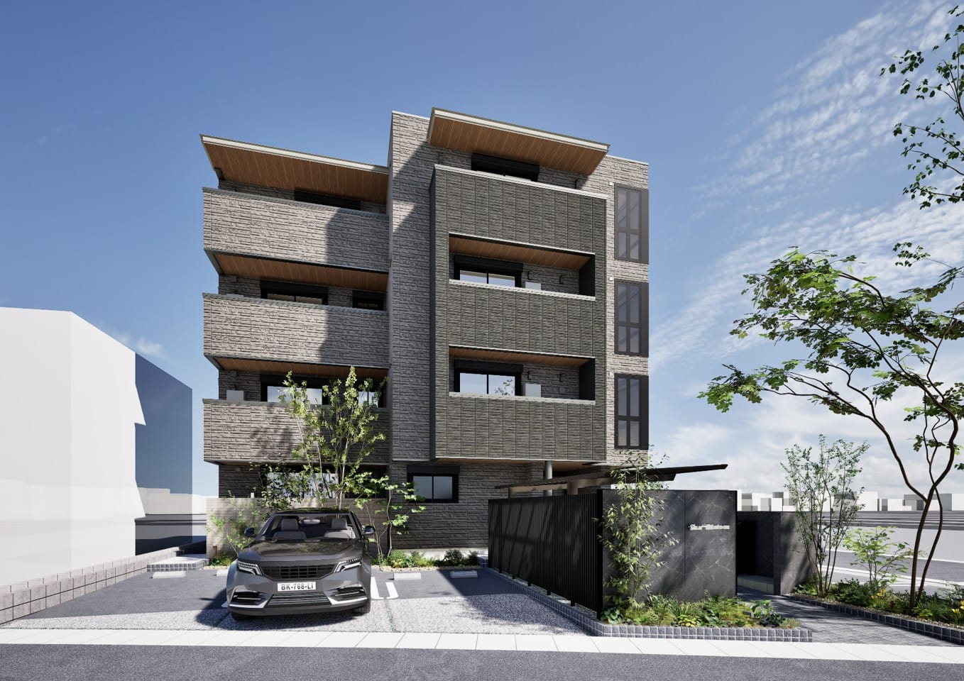 ・弊社の構造力を生かした2方向オーバーハングとタイル張りが印象的なファサードとしました。