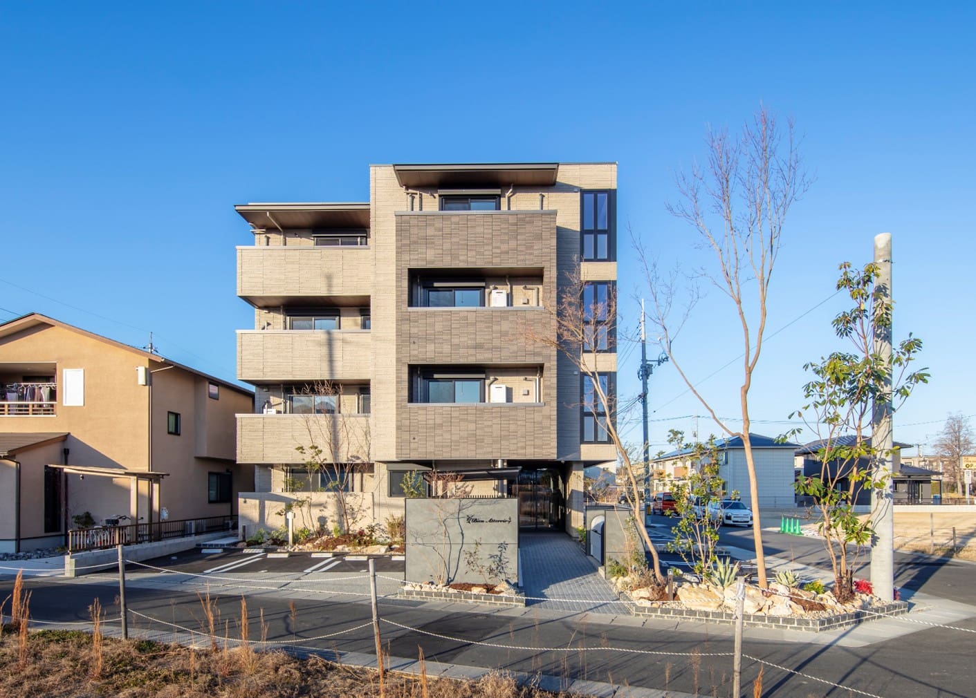 ・弊社の構造力を生かした2方向オーバーハングとタイル張りが印象的なファサードとしました。