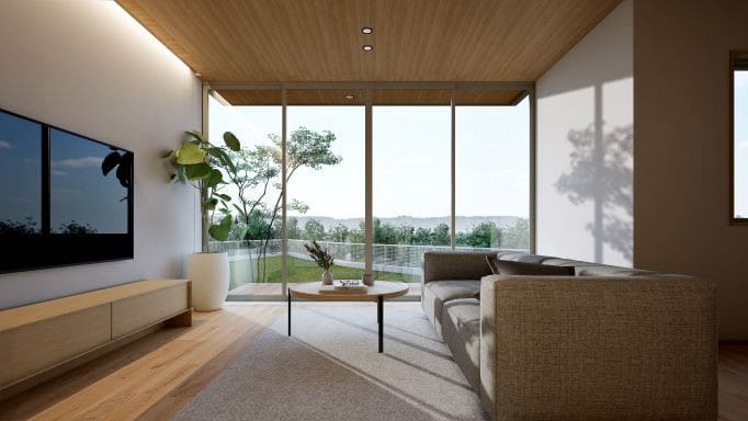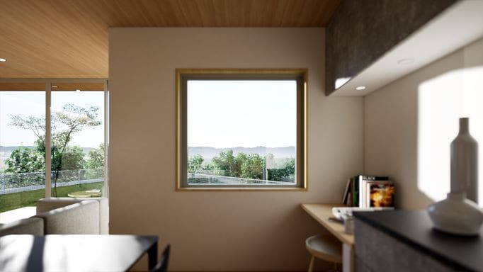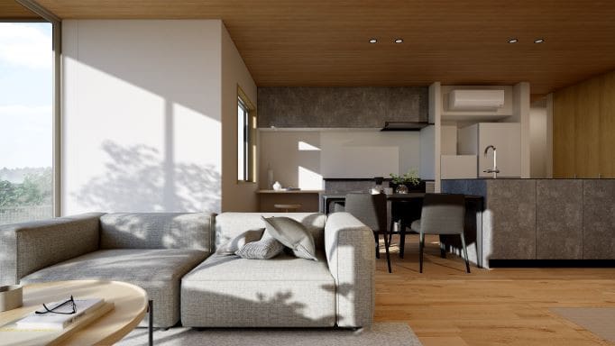 LDKの木質天井が窓の外の軒裏と繋がり、空間に一体感をもたらします。