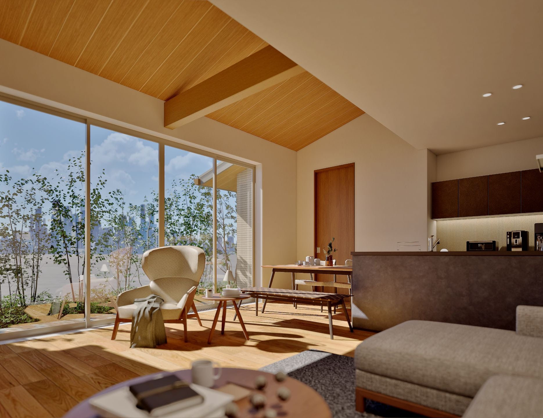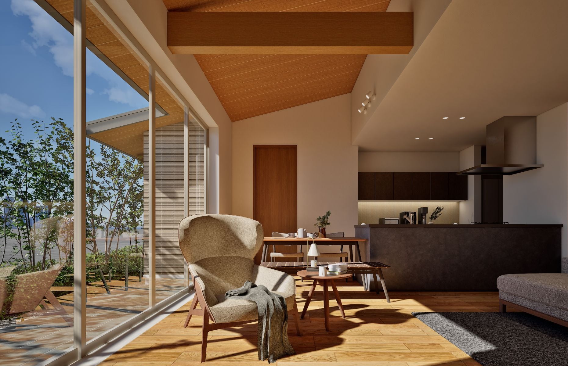 ★リビングは屋根勾配を活かした木調の勾配天井で、南面の大きな窓からは陽光がたっぷりと差し込み明るく開放感あるLDKです。