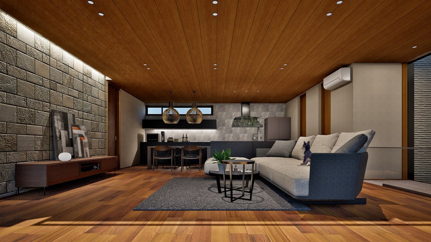 02.木調天井と石貼りの壁をつくり、自然素材を感じる室内空間