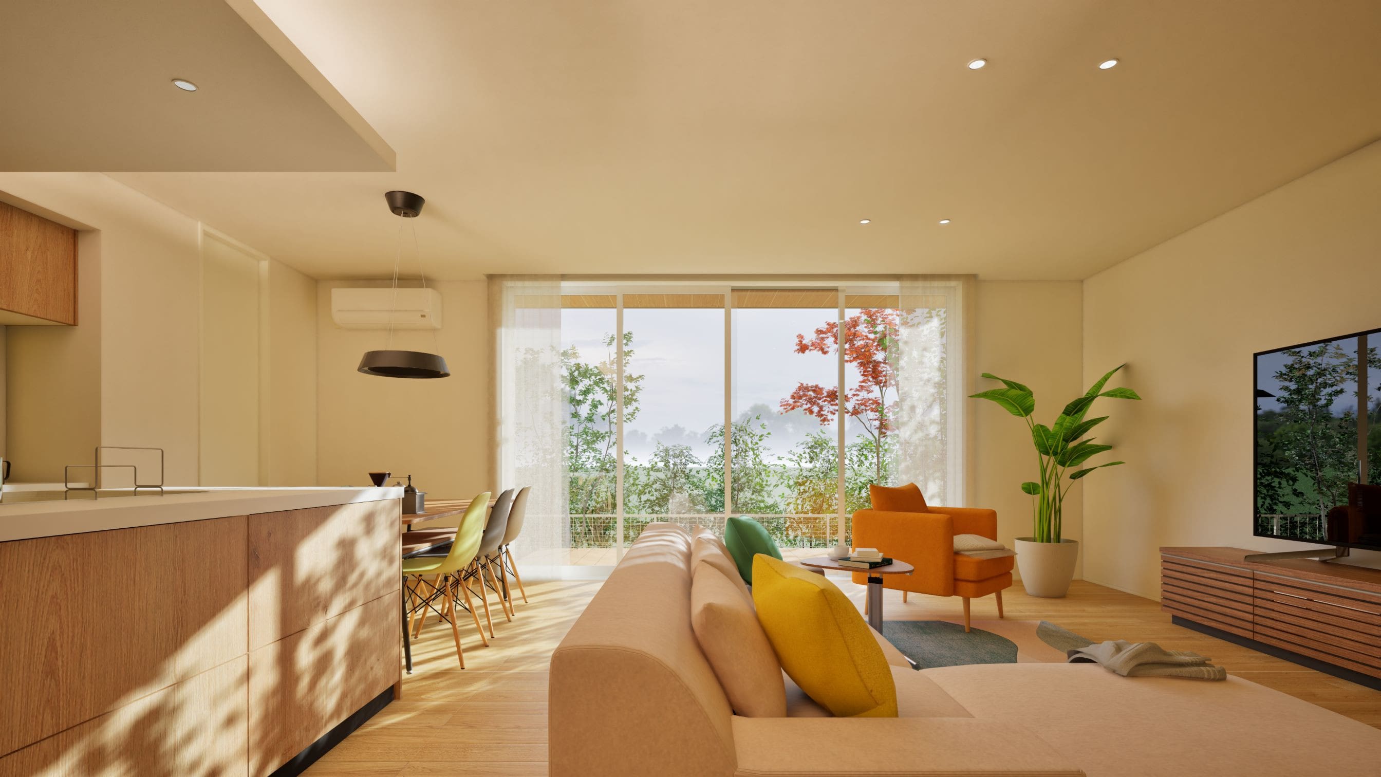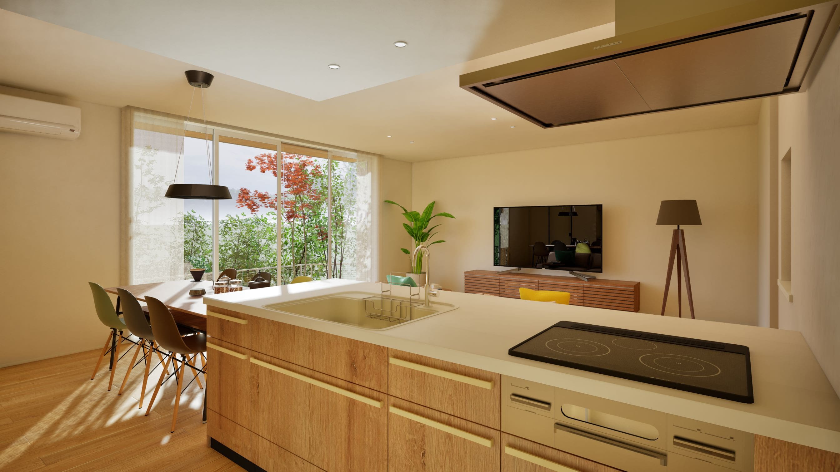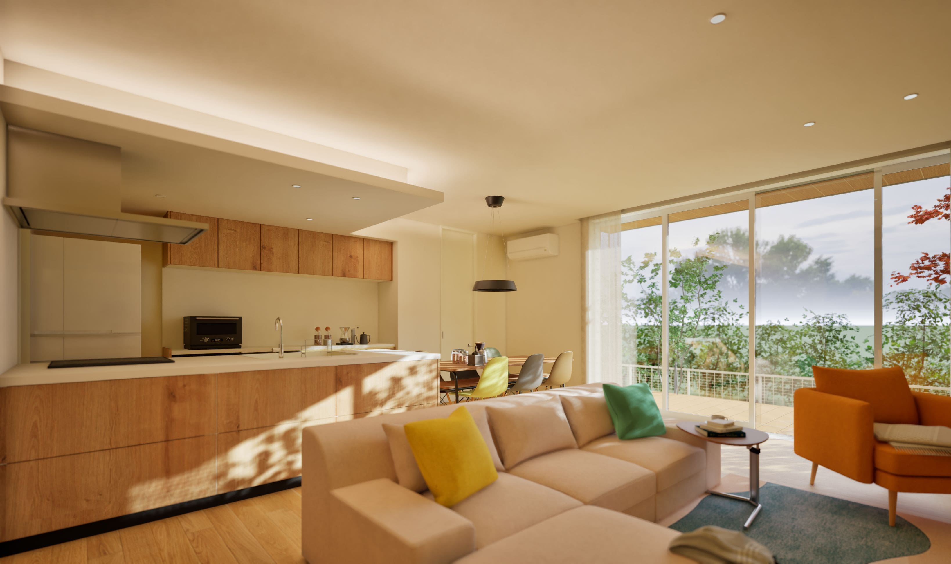 ★平屋の屋根勾配を利用した大きな吹抜け空間をとり、採光を確保した明るいLDK空間