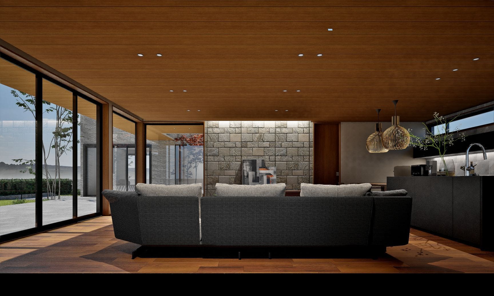 02.木調天井と石貼りの壁をつくり、自然素材を感じる室内空間