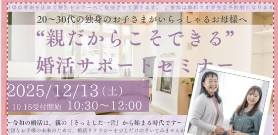 積水ハウス寺岡展示場にて、「“親だからこそできる”婚活サポートセミナー」を開催します。