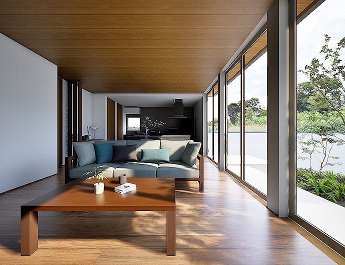 ■20帖以上の広々LDK空間と、床から天井までのクリアビューサッシの3連窓