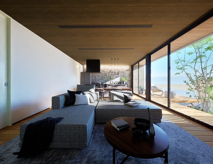 ◆木質天井と深い軒で外と内を曖昧にしたくつろげるLDK