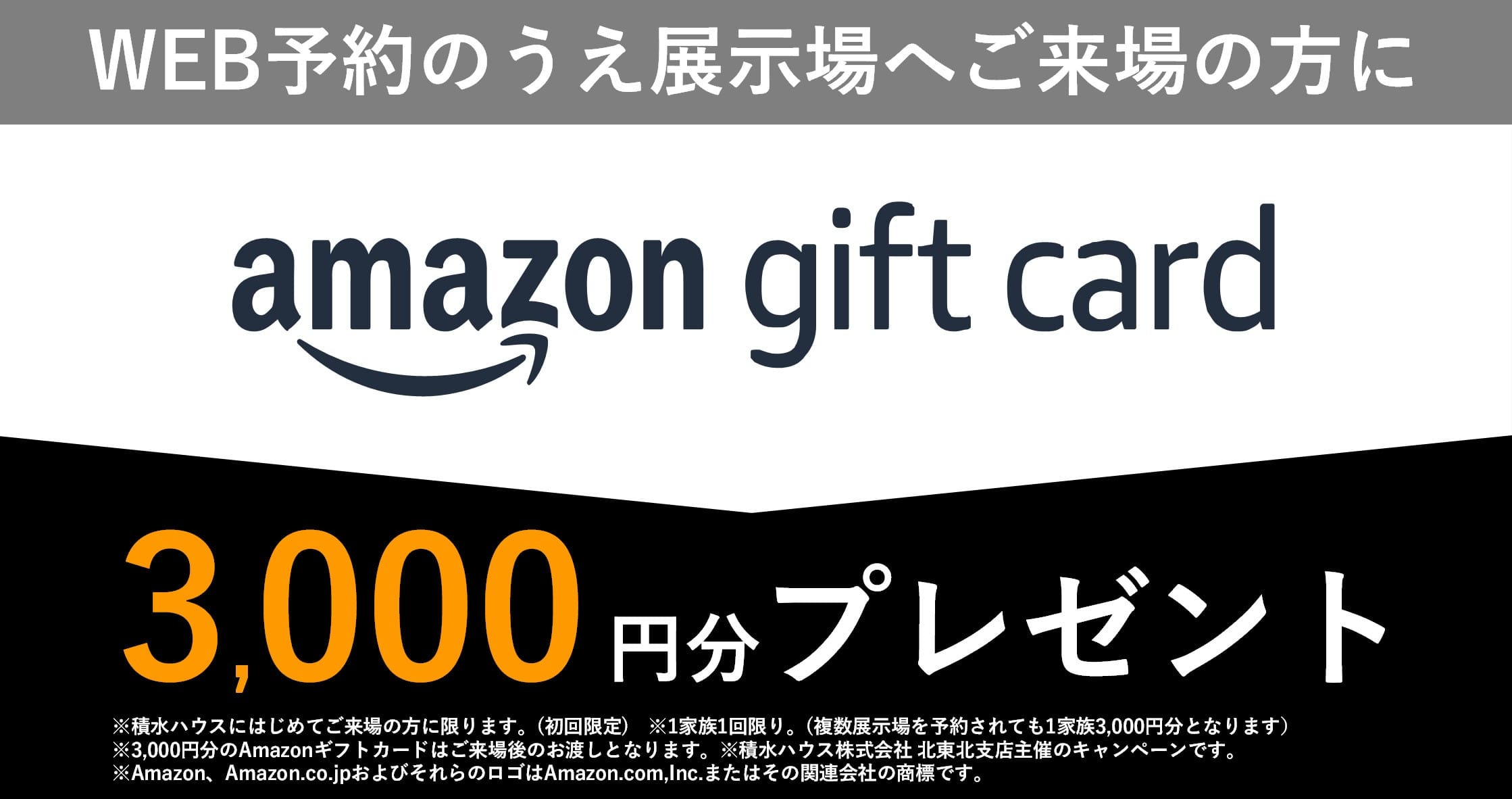 事前にWEBでご予約の上、初めてご来場いただいたお客様に「amazonギフトカード3,000円分」をプレゼントいたします。