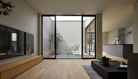 ①中庭を中心にリビングダイニングをつなぐ大空間