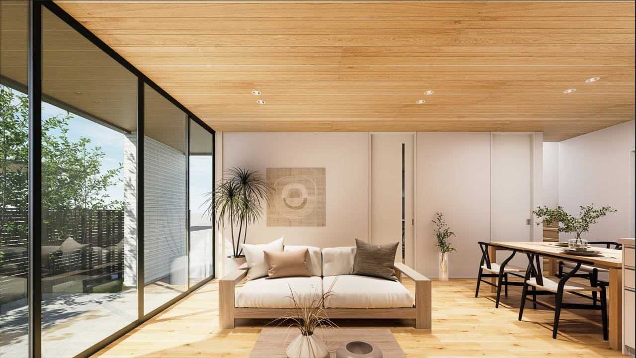 大開口フレームにより、スローリビングなどのこれまでにない開放感をそなえた空間が実現します。