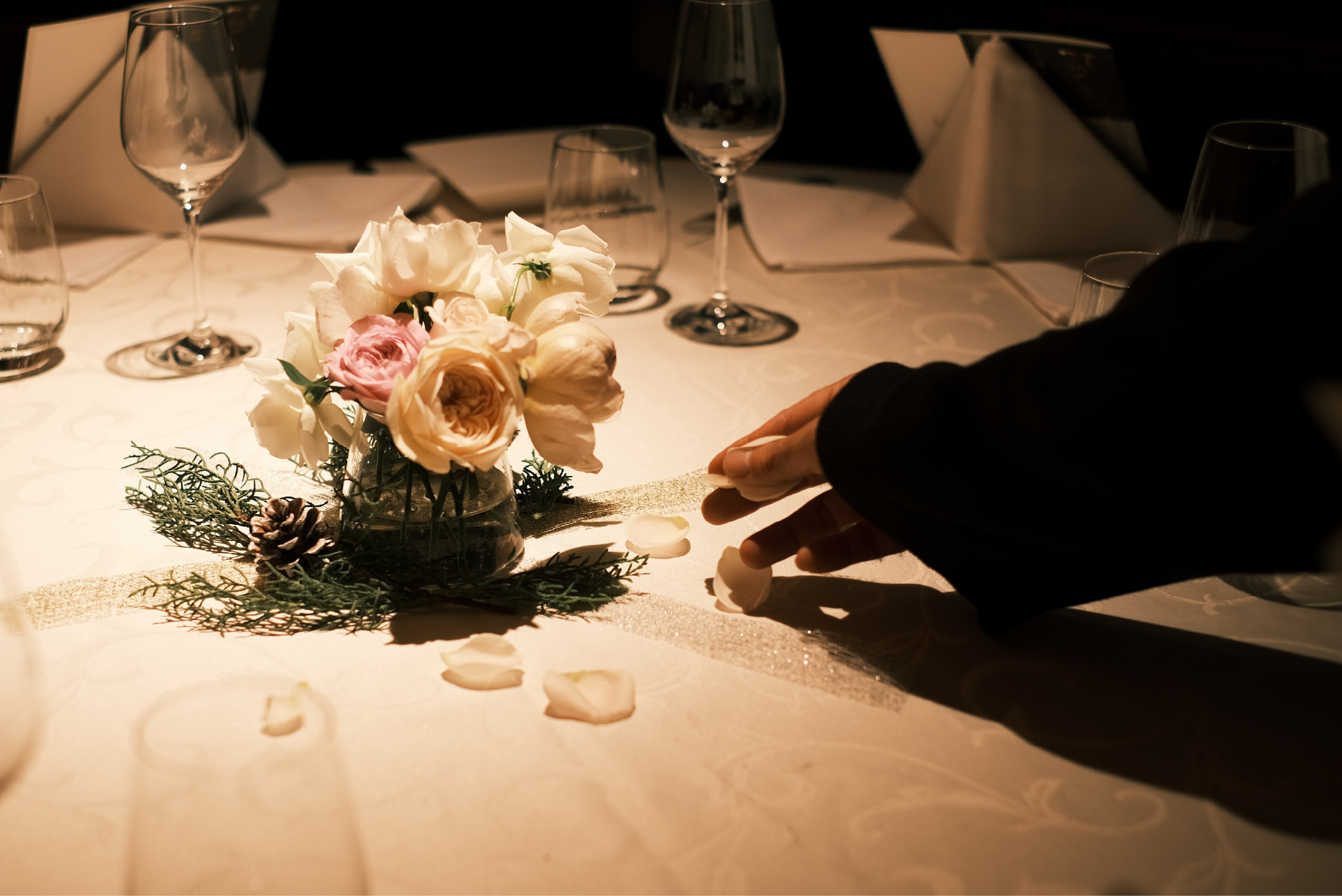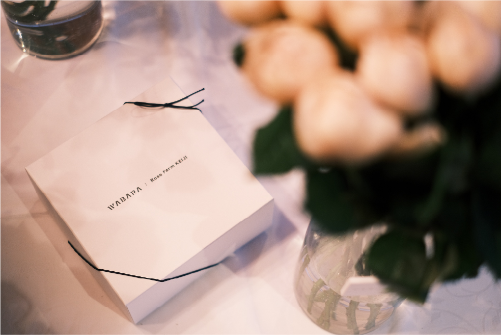 会場の中央には、この日のために特別に誂えた装花が据えられ、まるで一幅の作品のよう。彩りを添えるのは、滋賀県のRose Farm KEIJIが丹精こめて大切に育てた「WABARA(和ばら)」です。西洋のバラとは異なり、繊細で奥ゆかしい色彩と趣のある質感、淡い芳香を放ち、思わず触れたくなるような美しさを湛えています。どの席からもその美しさを楽しんでいただけるよう、華やかにレイアウトしました。