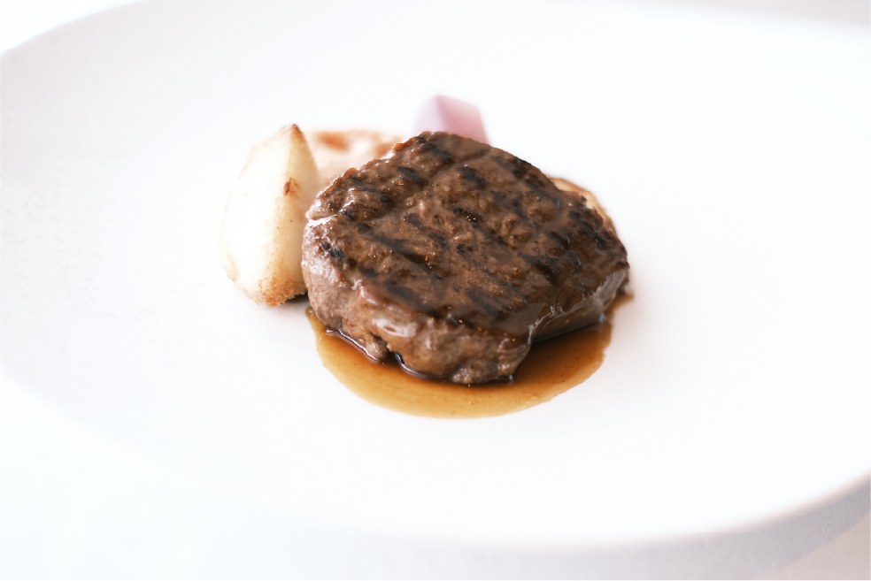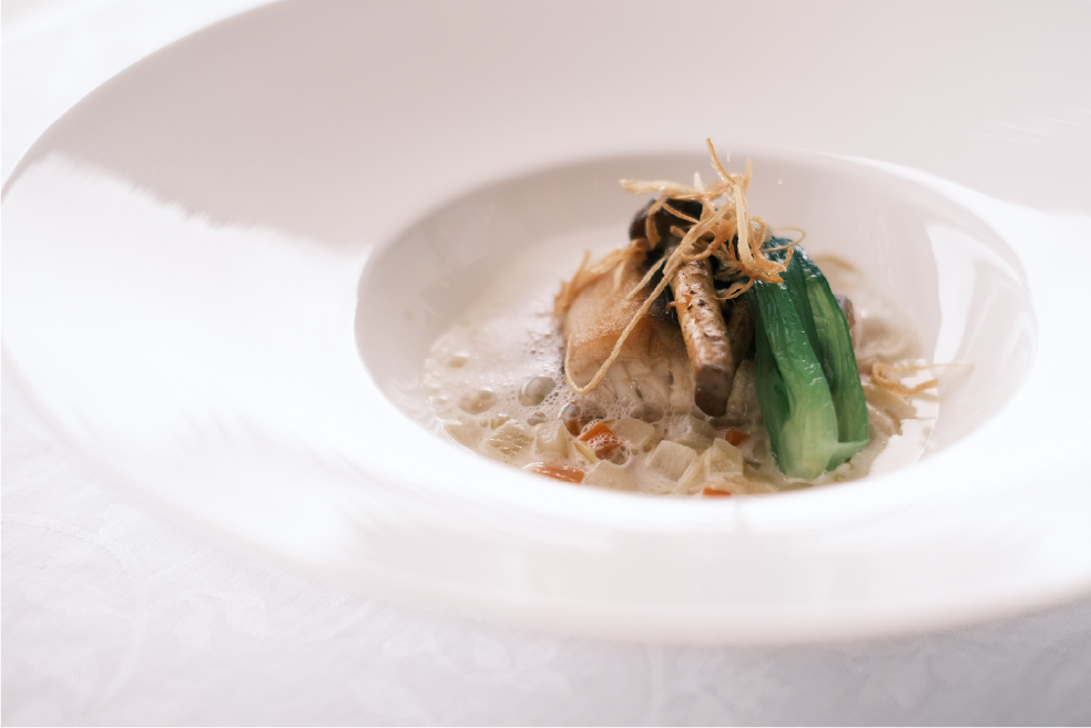 お待ちかねの特製フルコースの始まりは、アミューズから。「“ようこそ大濠公園へ”という歓迎の心を込めました」とシェフが語るように、大濠公園を象徴するスワンボートを模したスワンシューが登場。九州の旬の食材をふんだんに取り入れた料理が続き、長崎県産カツオの藁焼き、温かなキノコのスープ、サワラのポワレ、黒毛和牛のステーキと、それぞれに合わせたペアリングのドリンクも用意され、味わいの奥行きがいっそう広がります。