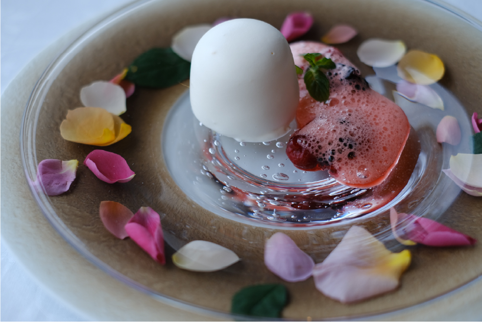 食事のあとは、「モンロールーム」と呼ばれる個室へ移り、空間装花を手がけたフラワーコラボレーター・志村大介氏とともにブーケづくりのひとときを。部屋いっぱいに広がる芳しい香りの中、凛と佇む12種類のWABARAが並びます。志村氏との対話を楽しみながらWABARAを選び、その想いを受けて、志村氏の手によってひとつのブーケへ。その中でひときわ目を引くのが、「シャルロット・ペリアン」という品種です。入手が難しいことでも知られ、パリのルイ・ヴィトン美術館で開催された建築家・デザイナー、シャルロット・ペリアンの回顧展にも用いられた逸品。日本が世界に誇るWABARAのストーリーを伝え、その美しさや唯一無二の価値をお届けする特別なおもてなしです。
