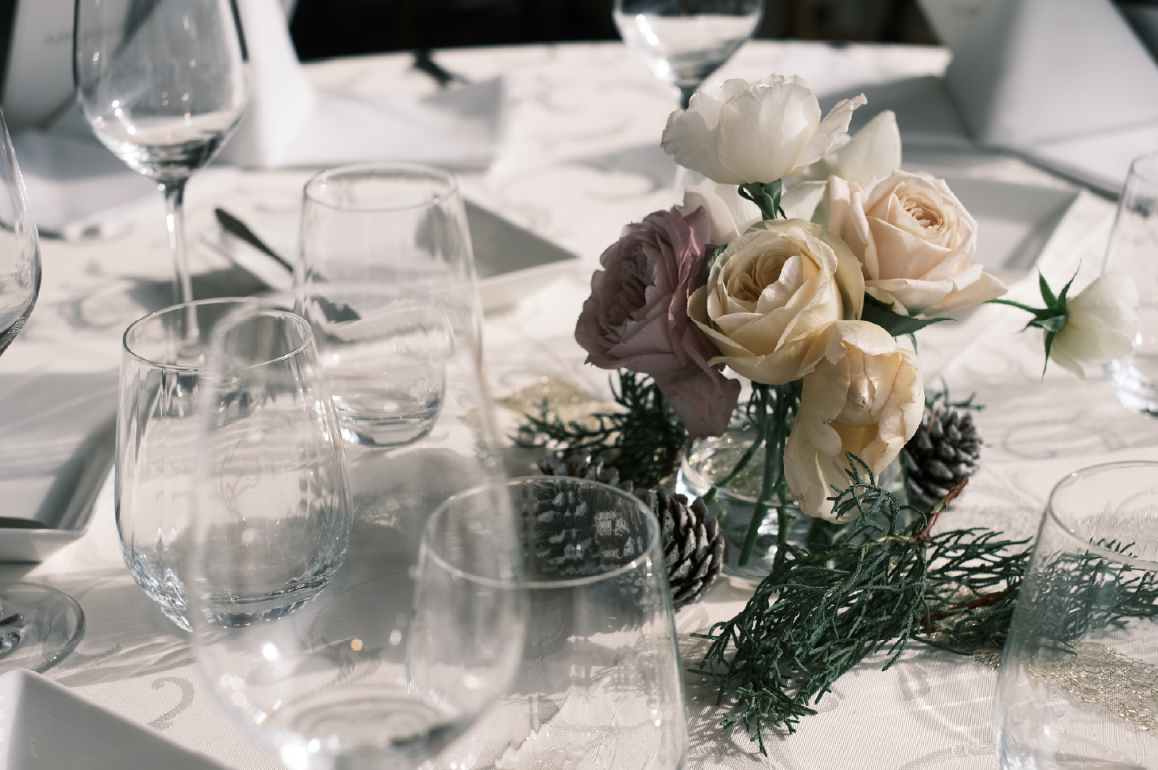 ウェルカムドリンクには、WABARAのエッセンスローズウォーターを使ったスパークリングワインをご用意。やわらかなロゼの色合いを手にしたゲストから笑顔が生まれ、テーブルでは「お久しぶりです」「お元気でしたか?」と、積水ハウス社員との再会を喜ぶ声が穏やかに交わされていました。