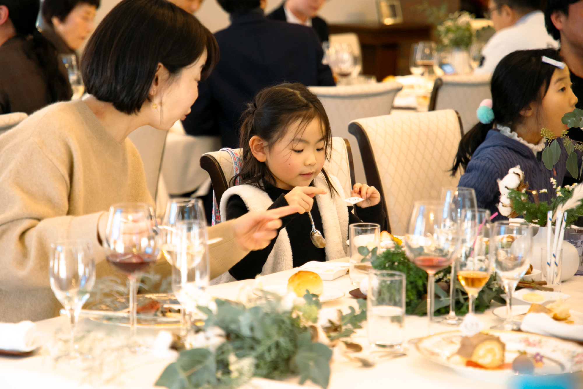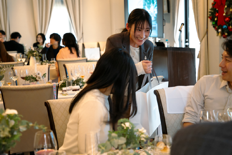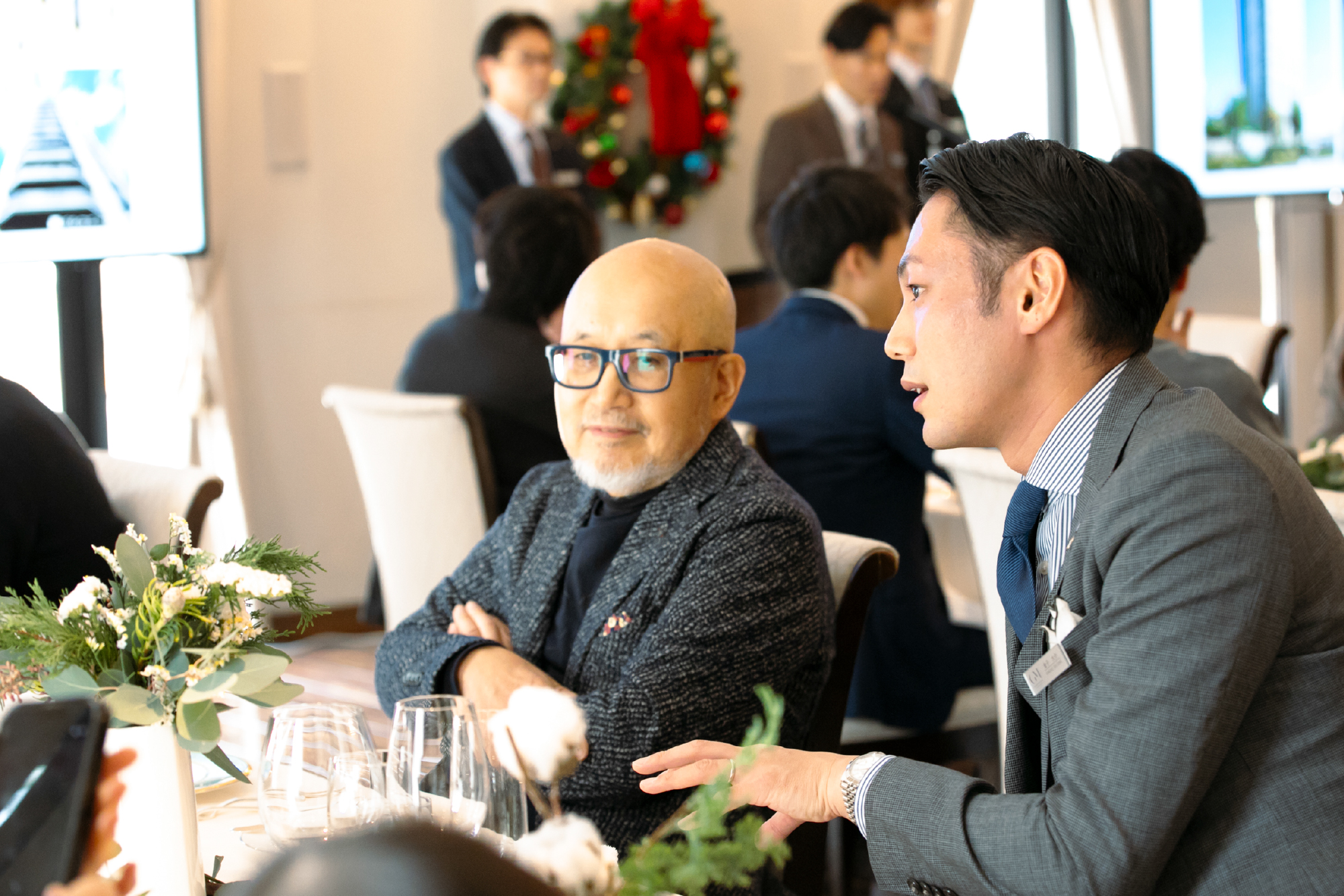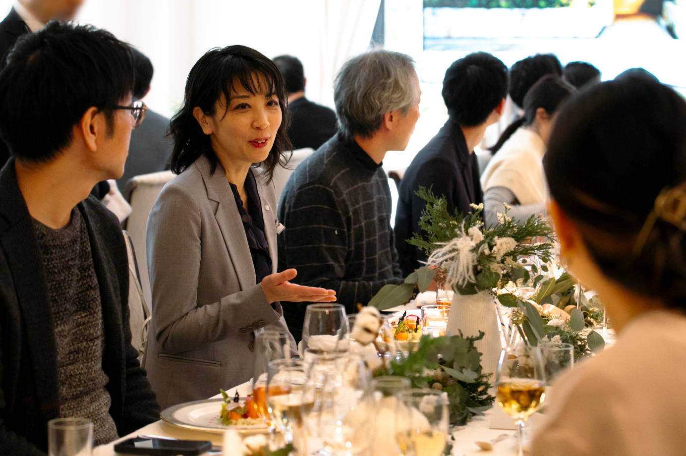 食事の合間には、ノリタケによるクリスマスならではのテーブルコーディネートの紹介も。華やかな食器のセレクトが、ホリデーシーズンらしいひとときを演出します。日常にそのまま持ち帰れる粋なおもてなしの提案に、オーナー様も自宅の食卓を思い浮かべるような表情を見せていました。