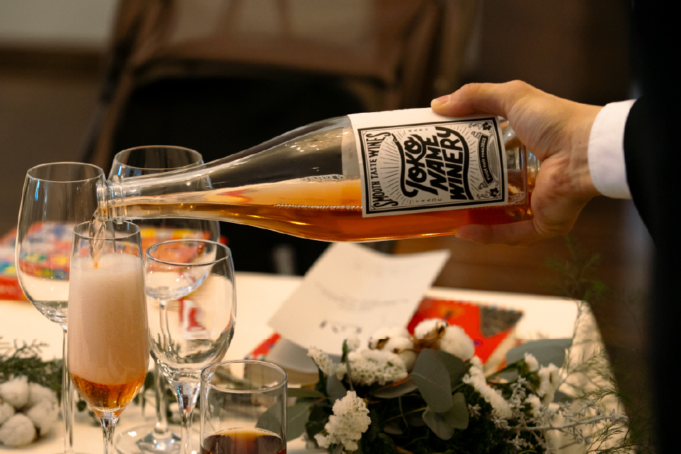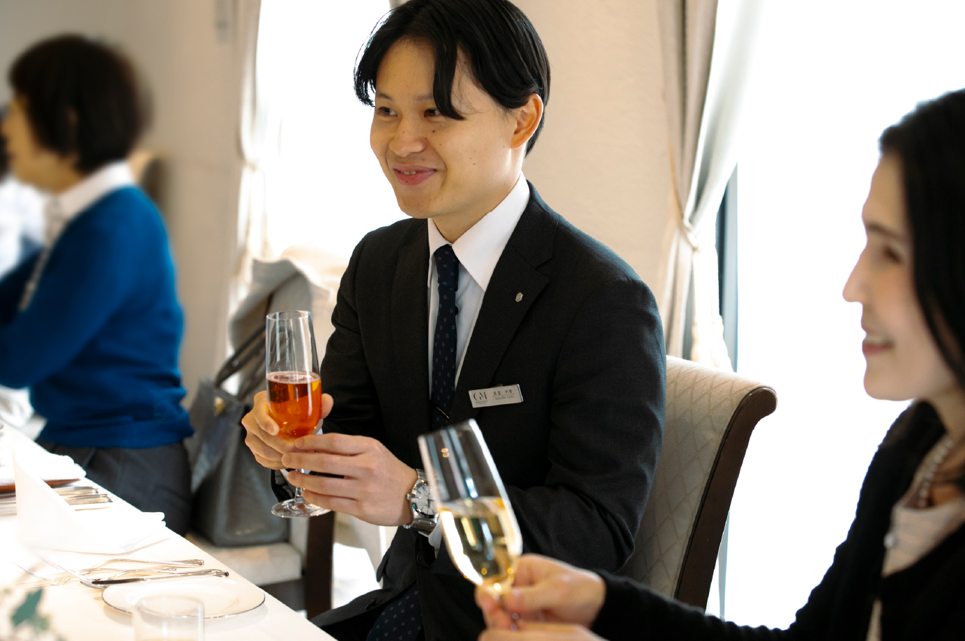 コースもいよいよ佳境へ。オマール海老、黒毛和牛と続くメインディッシュには、料理の力強さや繊細さに寄り添う愛知県産ワインが合わせられ、ひと口ごとに表情を変えるマリアージュが、ゆったりとした充足感をもたらしました。各テーブルで笑顔があふれ、食事の時間がさらに深まっていきます。
