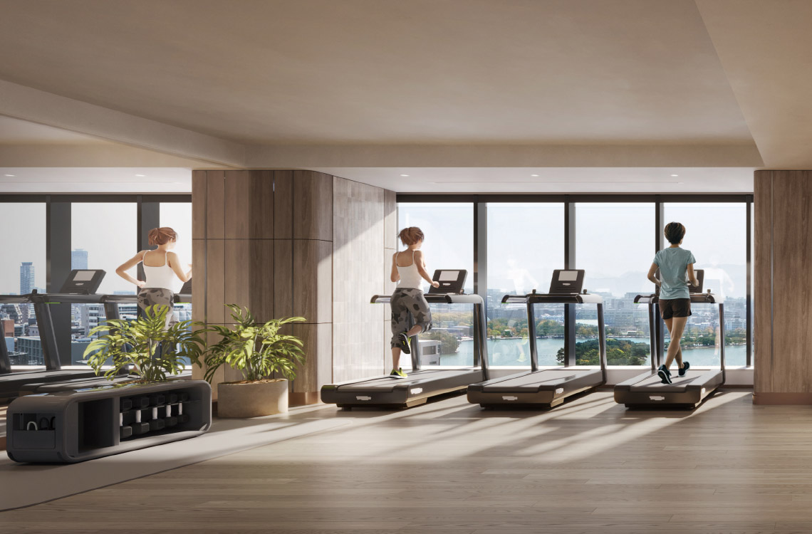 - 掲載のトレーニングジム完成予想CGは図面を基に描き起こしたものであり、形状・色味等は実際とは異なります。なお、仕上げ材や設備器具は設計段階のものであり、変更となる場合がございます。また、照明器具等再現していない設備機器がございます。家具・調度品等は計画段階のものであり、変更となる場合がございます。窓外の眺望写真は、現地16階相当の写真(2025年4月撮影)を合成し、CG処理を加えたもので、実際とは異なります。また、将来的に眺望を保証するものではありません。利用時間の制限があります。