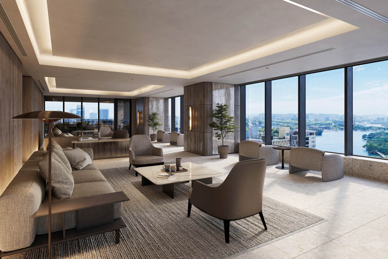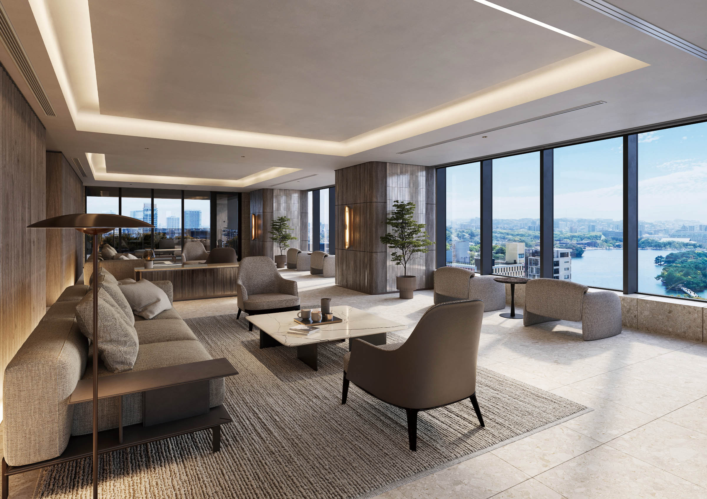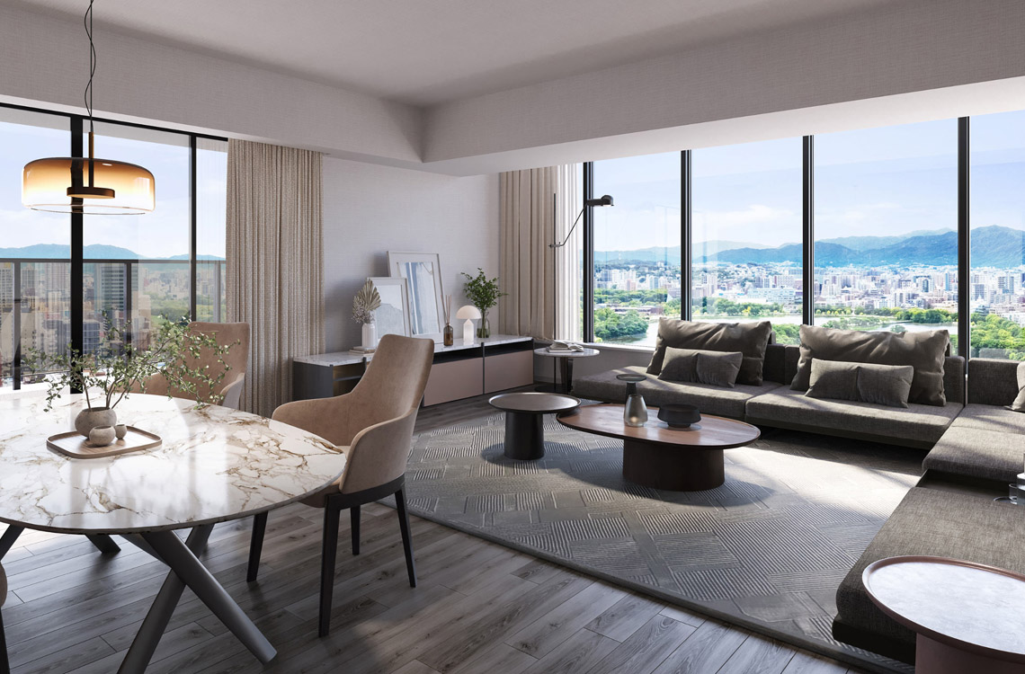 - 掲載のスカイラウンジ完成予想CGは図面を基に描き起こしたものであり、形状・色味等は実際とは異なります。なお、仕上げ材や設備器具は設計段階のものであり、変更となる場合がございます。また、照明器具等再現していない設備機器がございます。家具・調度品等は計画段階のものであり、変更となる場合がございます。窓外の眺望写真は、現地15階相当の写真(2025年4月撮影)を合成し、CG処理を加えたもので、実際とは異なります。また、将来的に眺望を保証するものではありません。