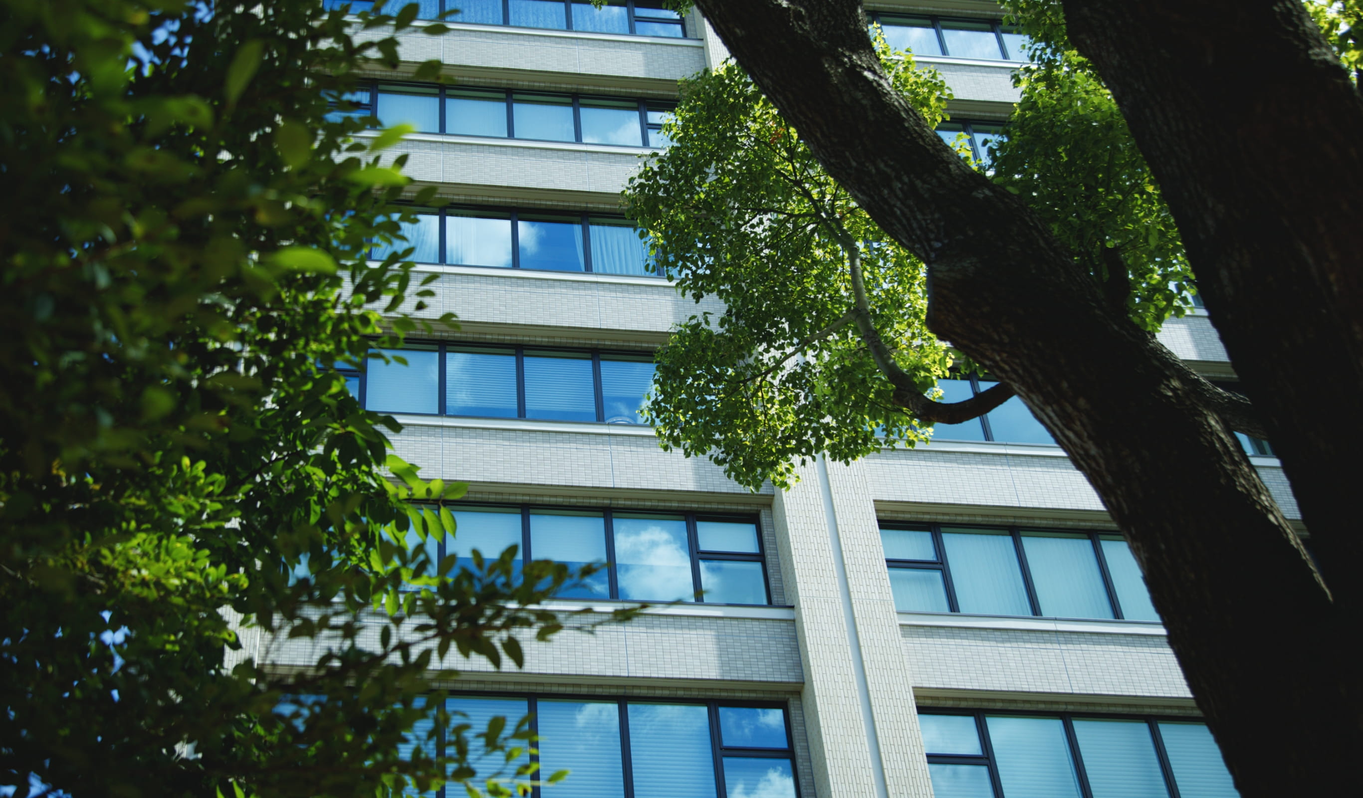 長堀通りを挟んで南の清水谷町にある「グランドメゾン清水谷オーナーズハウス」もまた、南側に広がる清水谷公園の植生が存分に眺められる三方角地という好立地にある。設計を担当した積水ハウスの大阪マンション事業部設計室の前田孝二朗さんは、このエリアの長い歴史が育んできた特有の地形を大きく活用することを心がけたという。