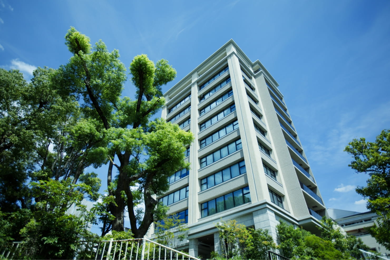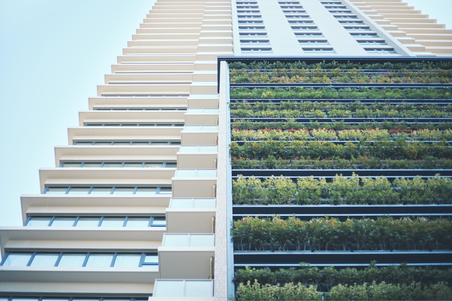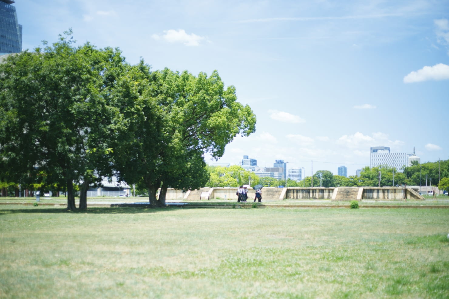 この地で20年以上も〈グランドメゾン〉を展開してきた積水ハウスの大阪マンション事業部事業開発室の宮﨑大介さんは「古くから人々の生活が営まれてきた場所であり、強固な地盤である上町台地は、大阪の豊かな歴史と自然を住まいに取り込める希少なエリア」と語る。難波宮跡の南東に位置する「グランドメゾン上町一丁目タワー」では、東側に面した寺山公園とつながる緑地が全面積の半分以上を占める。積水ハウスの大阪マンション事業部設計室の辻岡壮亮さんは、こうした自然環境の豊かさをその設計に活かすことを意識したという。