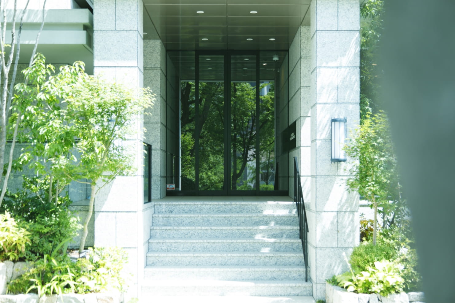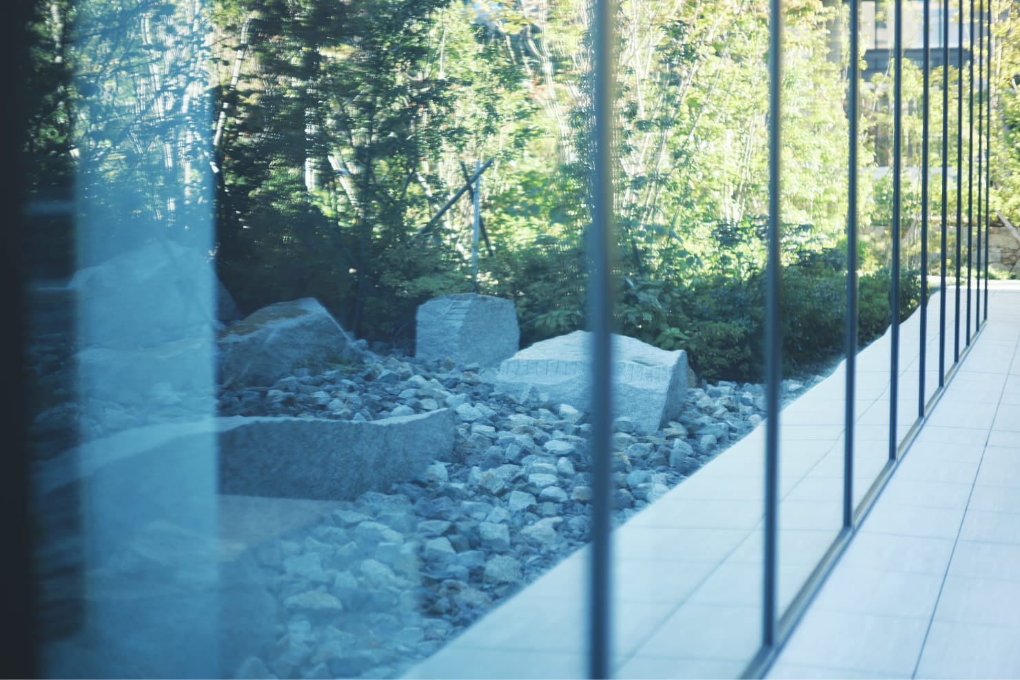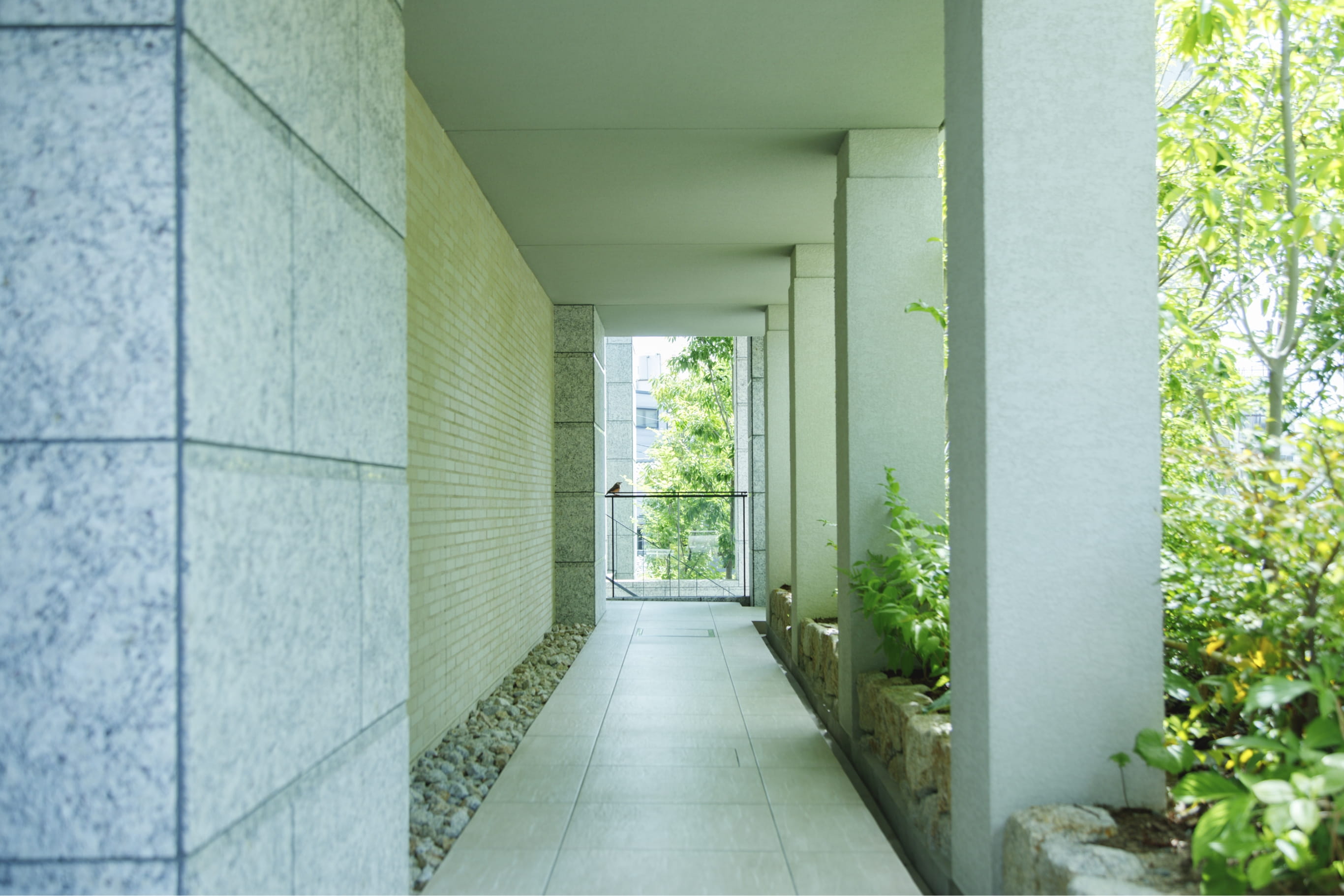 「マンション北側のアプローチは、誘われるような並木道のアプローチを設けました。そのゲート部分には大きな自然石を象徴的に配し、ひとたび中へ入ると静かで落ち着いた緑地を散策できるように計画しました。また、隣接の公園では子供たちが遊具で遊ぶ様子が感じられ、風景の中で静と動のグラデーションをつくることを意識しています。またマンションの壁面にも緑化を行い、遠くから建物を見ても緑と窓に映る青い空が眺められ、いつも『わが家』を感じていただけるようにと考えました」