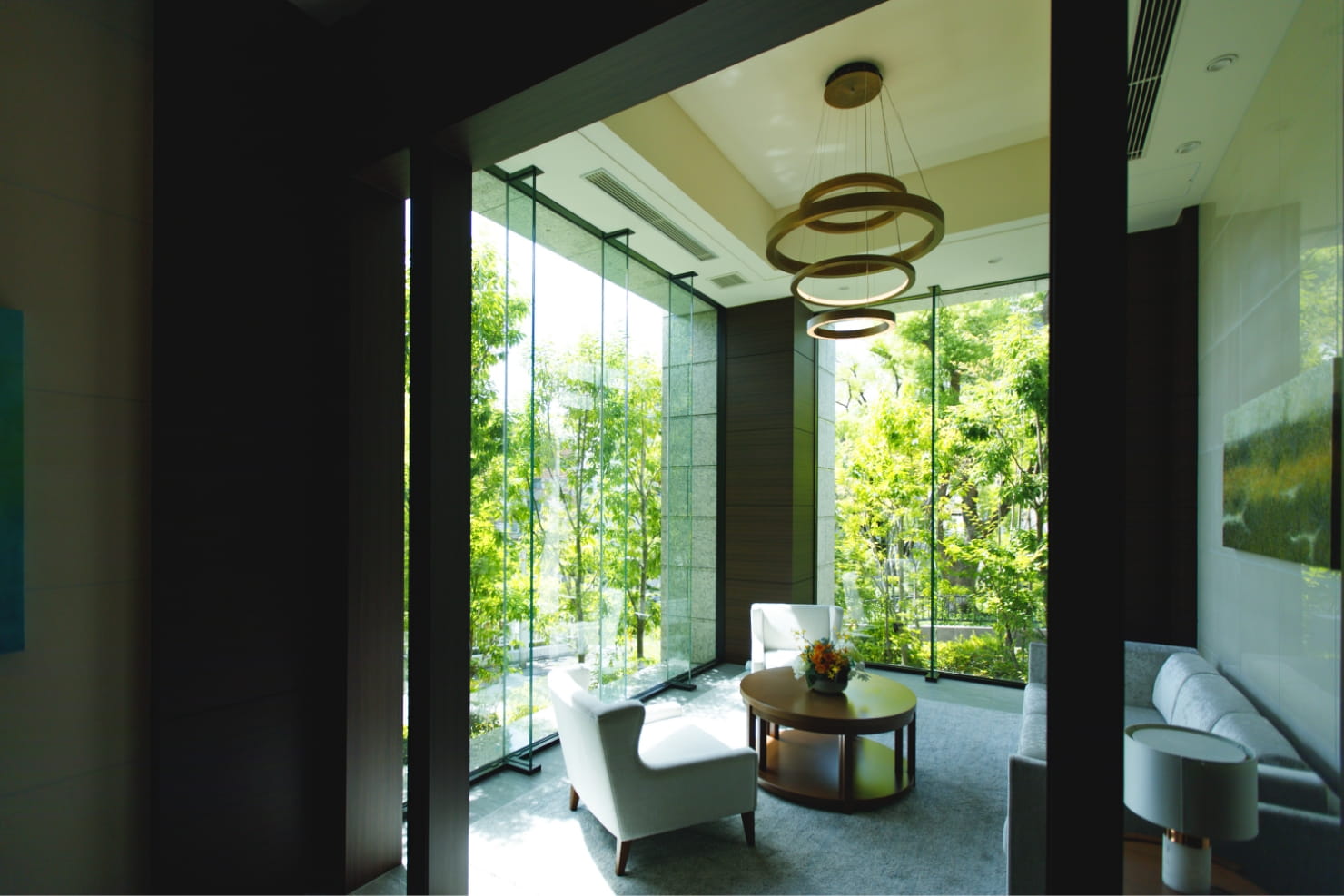 「グランドメゾン清水谷オーナーズハウスが建つ土地は、大阪城の外郭だった惣構えの南部にあたります。隣の空堀町という地名のとおり、かつて大阪城の外堀だったこの地域は、堀跡の窪地をまたぐように街が形成されていて坂が多い。この物件も南側の公園が断崖の斜面に大きく広がる形になっているので、マンションの4階くらいまでリビングから公園の木々を借景として楽しめます。その魅力を存分に活かすため、南側にはバルコニーや手すりを排除して、サッシュの天端を天井高に合わせた大きな開口部から、視線が自然と上を向くよう工夫しました。ソファに腰掛けて、四季折々の風景をゆっくりと味わっていただきたいですね」