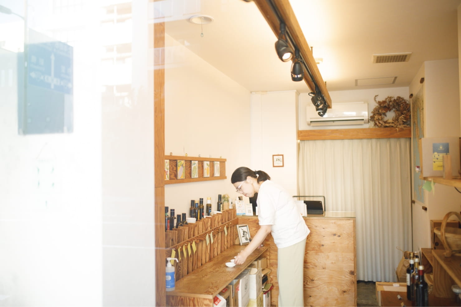 難波宮跡から上町筋を下ること数分の「Casa Olearia PACE(カーサ・オレアリア・パーチェ)」も、イタリアで古くから培われた食文化を伝えてくれるオリーブオイルの専門店。オーナーの森尾宮枝さんはかつてイタリアで暮らしていた頃、それまで意識したことのなかったエクストラヴァージン・オリーブオイルの味の違いを知ってその魅力にハマり、「好きが高じて」大阪では稀な専門店をオープンした。