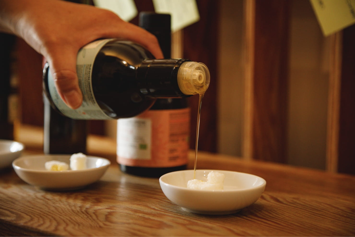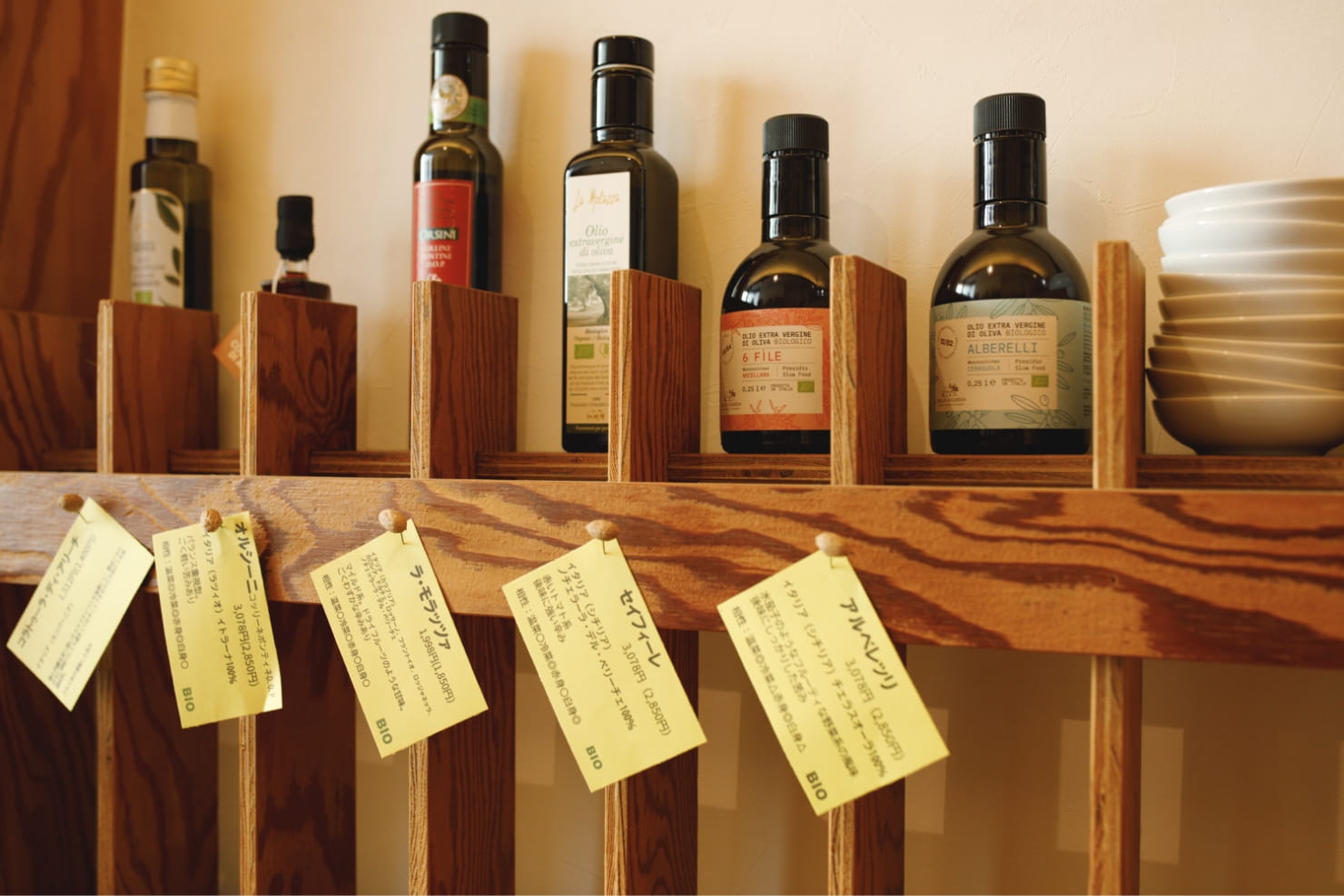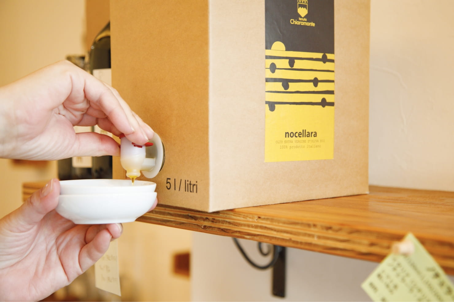 店内にはイタリア現地の多様な生産者が作るオリーブオイルの稀少なボトルが並び、幅広い味を少量ずつテイスティングして好みを確かめながら買い物ができる。マイボトルを持参して、量り売りのオイルを購入する常連客も少なくないとか。
